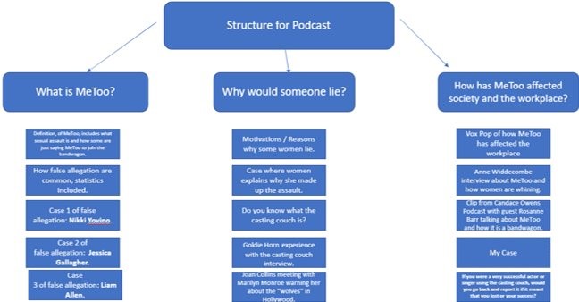 I developed my production from my original idea, initially I wanted to have one long podcast that would have the beginning, middle and end for the untold truth of MeToo, but was suggested to me by a mentor that I should instead do a documentary series (a several part documentary of short audio clips) of the untold truth of MeToo, but dedicate each part to the certain topic of my series. I have adapted my podcast by forming a new script with the most important elements of unveiling the truth of false allegations and sexual assault. The audio that I have produced is the final episode of the series, revealing the end product of what I wanted my demographic to hear, and as a result of what they have listened to it will hopeful open their eyes and make them question their opinion.